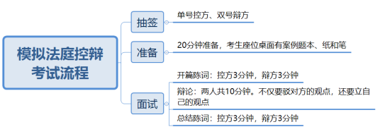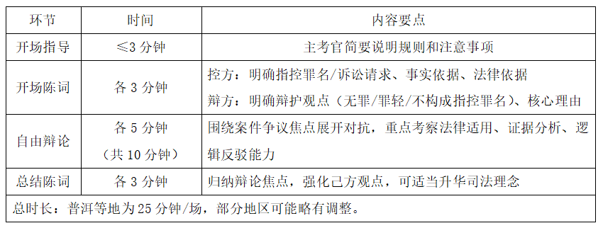 云南省考模拟法庭控辩面试基本流程 一、 报到与抽签 时间要求:面试当天上午7:00前到达考点,7:30前进入指定候考室。 所需材料:有效身份证、加盖资格复审单位印章的笔试准考证、资格复审确认单。 抽签内容: 面试顺序号; 控辩角色(控方/辩方)——同一职位考生两两一组进行对抗; 考题类型(刑事或民事案例); 特殊情况:等额面试或抽签后轮单的考生,由面试组织单位安排工作人员扮演对方角色。 二、封闭备考(20分钟) 进入备考室,在工作人员监督下阅读案卷材料(含案情、证据、当事人信息等)。 可使用提供的纸笔撰写发言提纲,提纲可带入考场。 禁止携带手机、笔记等个人资料。 三、 模拟法庭控辩(核心环节,约25分钟) 进入考场后,按以下流程进行控辩对抗: 注意: 考生的考题类型由小组代表抽签完成,从而决定是刑案还是民案。等额抽完签还单着的考生会有招考单位组织安排工作人员来进行考试,无论是何种情况,考生都要做好准备,也要提前做好面试的练习,才能在面试中有备无患,脱颖而出!