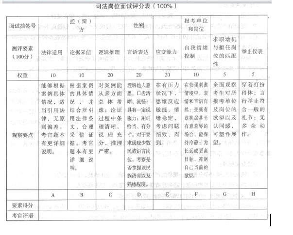 法庭控辩模式面试测评要素有八种,一为法律适用;二为论据(证据)采信;三为逻辑推理;四为言语表达;五为应变能力;六为自我情绪控制;七为求职动机与拟任职位的匹配性;八为举止仪表。
