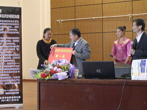 在2011年司法考试中,中法网学校昆明分校取得了优异的成绩,在活动中,阮老师兴致勃勃的为取得状元的学员颁奖。当高分学员从阮老师的手中接过奖励证书,会场响起了长久而热烈的掌声。