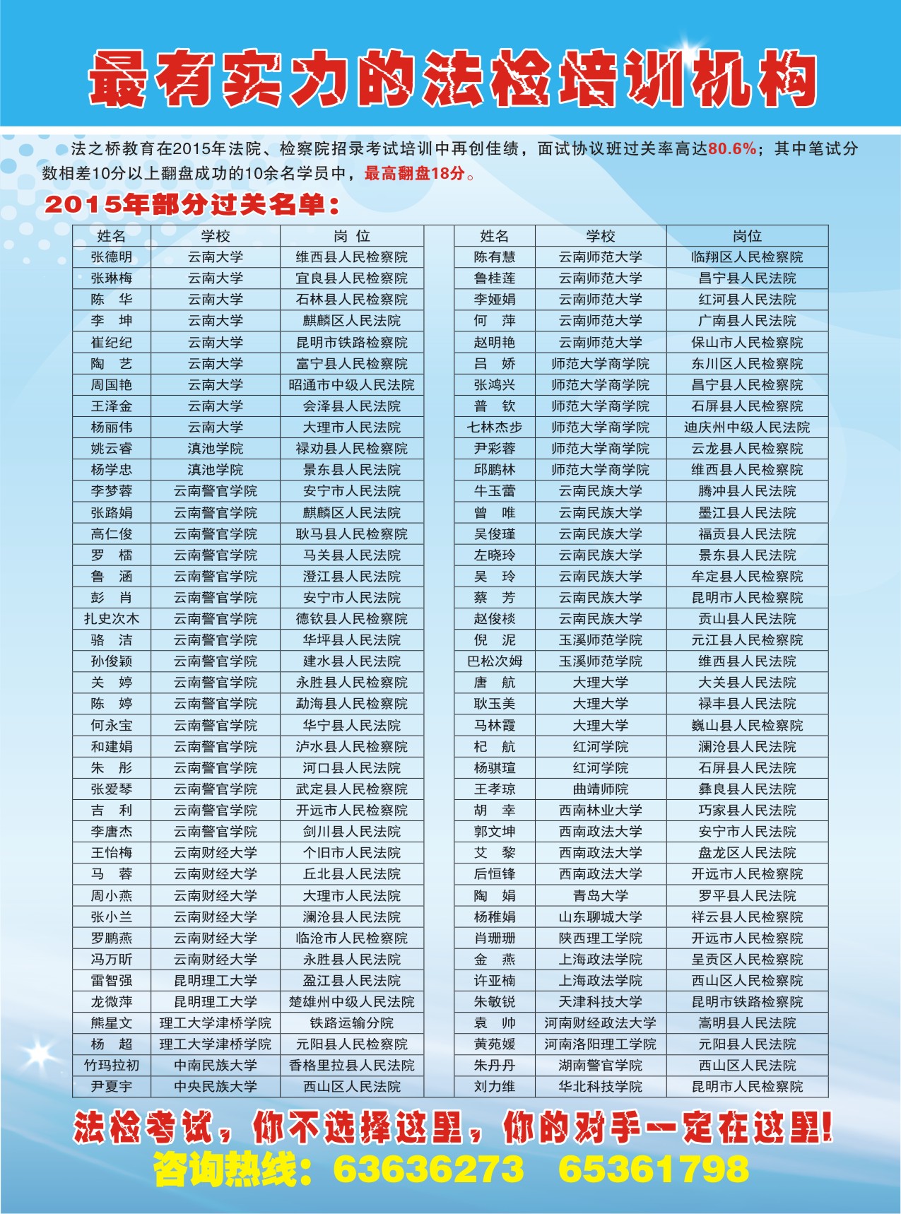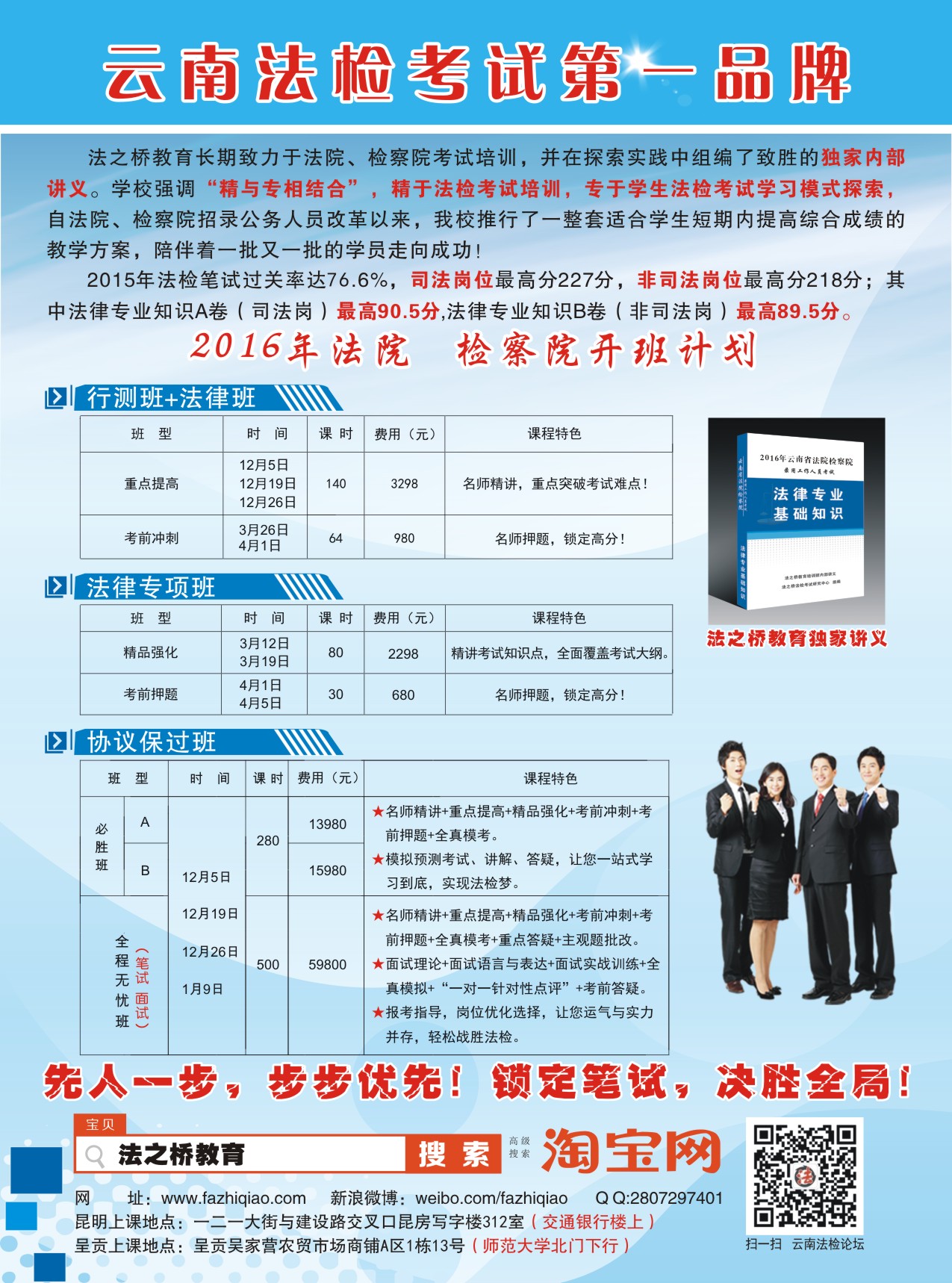 法之桥,云南法检考试培训第一品牌!实力无价!!司法岗、非司法考生法律基础成绩冲过90分,每年都在上演着,2015年省考40%多的司法岗上岸者都来法之桥…