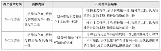 基本问题:哲学的基本问题是思维与存在的关系问题。思维和存在的关系问题又可以表述为意识与物质的关系问题或精神与物质的关系问题。