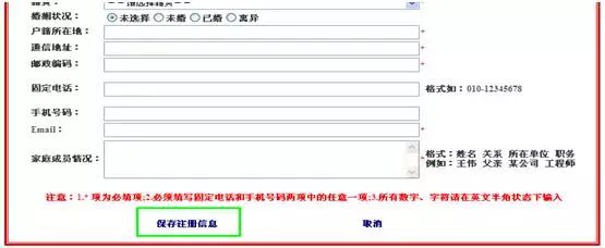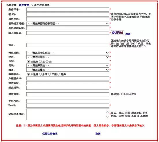 * 项为必填项,但考生们需要注意的是,尽管固定电话和手机号码之前没有*,但这两项必须填写一项,否则无法完成注册。