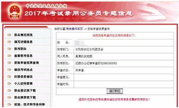 16、在报考完职位注意查看自己时候通过审核。报考人员请于2016年10月15日8:00至24日18:00期间登录考录专题网站查询是否通过了资格审查。通过资格审查的,不能再报考其他职位。2016年10月15日8:00至24日18:00期间,报考申请尚未审查或未通过资格审查的,可以改报其他职位。2016年10月24日18:00至26日18:000期间,报考申请未审查或未通过资格审查的,不能再改报其他职位。
