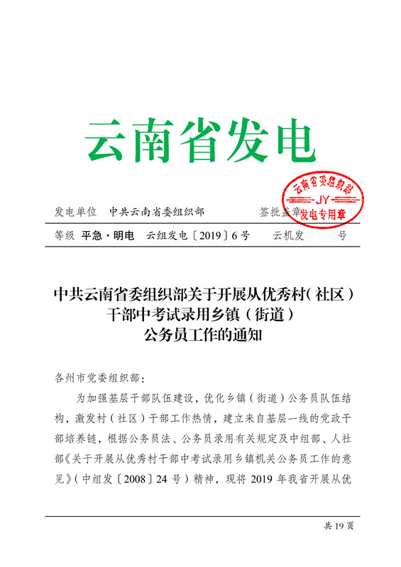 为加强基层干部队伍建设,优化乡镇(街道)公务员队伍结构,激发村(社区)干部工作热情,建立来自基层一线的党政干部培养链,根据公务员法、公务员录用有关规定及中组部、人社部《关于开展从优秀村干部中考试录用乡镇机关公务员工作的意见》(中组发〔2008〕24 号)精神,现将 2019 年我省开展从优秀村(社区)干部中考试录用乡镇(街道)公务员工作有关事项通知如下: