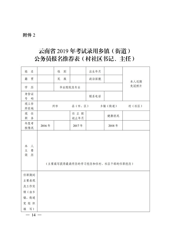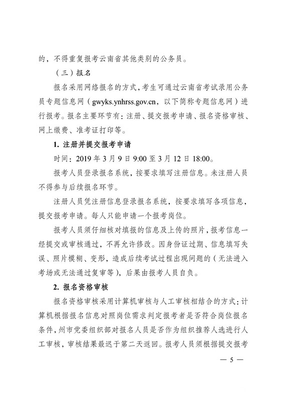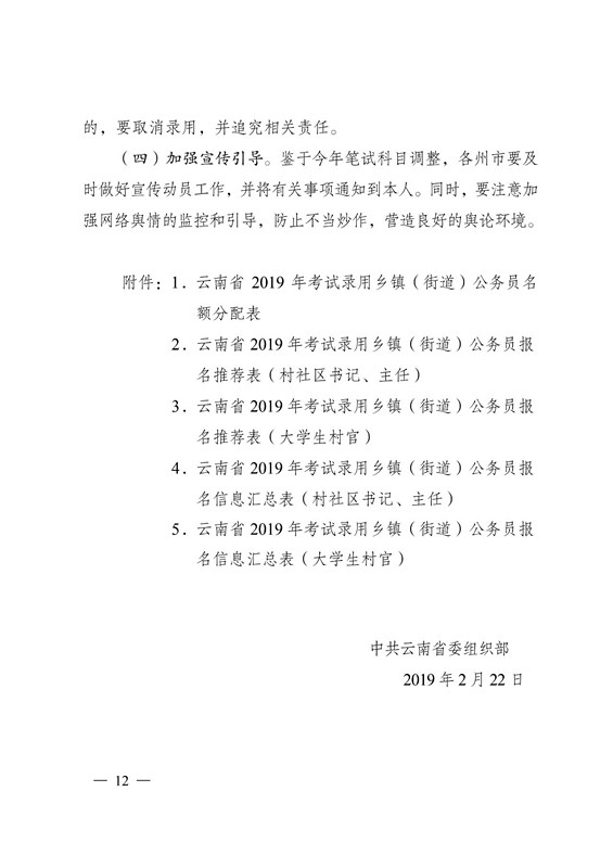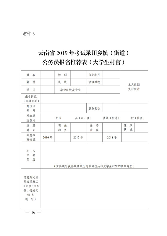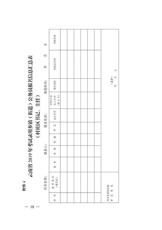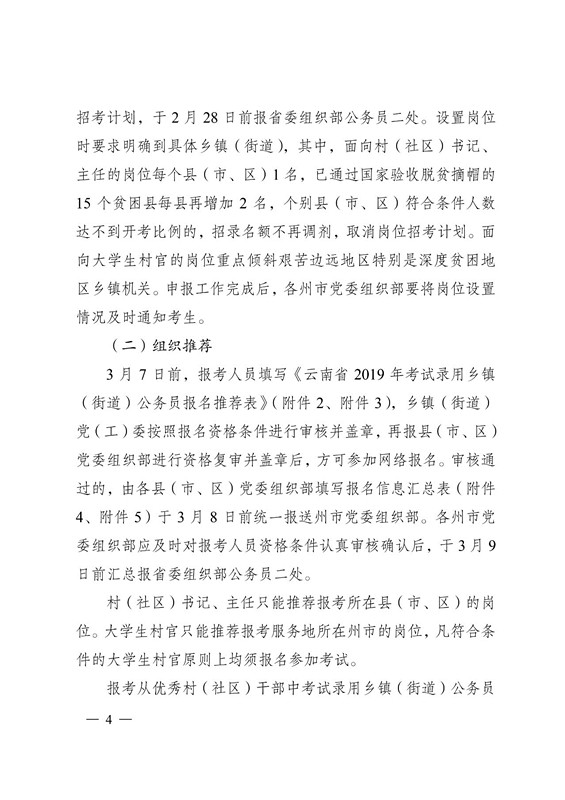 3 月 7 日前,报考人员填写《云南省 2019 年考试录用乡镇(街道)公务员报名推荐表》(附件 2、附件 3),乡镇(街道)党(工)委按照报名资格条件进行审核并盖章,再报县(市、区)党委组织部进行资格复审并盖章后,方可参加网络报名。审核通过的,由各县(市、区)党委组织部填写报名信息汇总表(附件4、附件 5)于 3 月 8 日前统一报送州市党委组织部。各州市党委组织部应及时对报考人员资格条件认真审核确认后,于 3 月 9日前汇总报省委组织部公务员二处。村(社区)书记、主任只能推荐报考所在县(市、区)的岗 位。大学生村官只能推荐报考服务地所在州市的岗位,凡符合条件的大学生村官原则上均须报名参加考试。