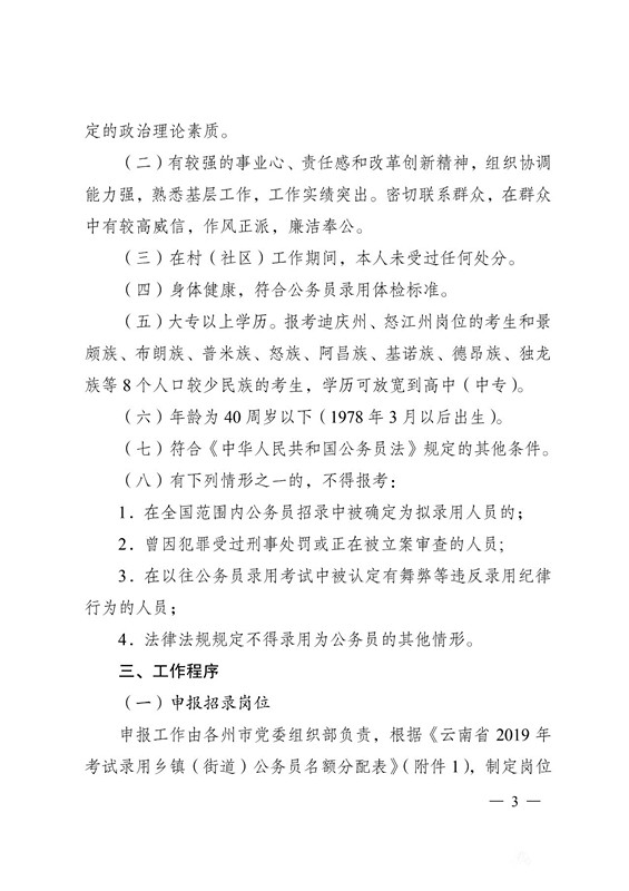 (五)大专以上学历。报考迪庆州、怒江州岗位的考生和景颇族、布朗族、普米族、怒族、阿昌族、基诺族、德昂族、独龙族等 8 个人口较少民族的考生,学历可放宽到高中(中专)。
