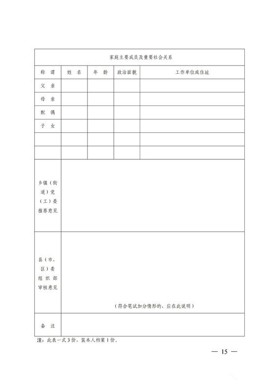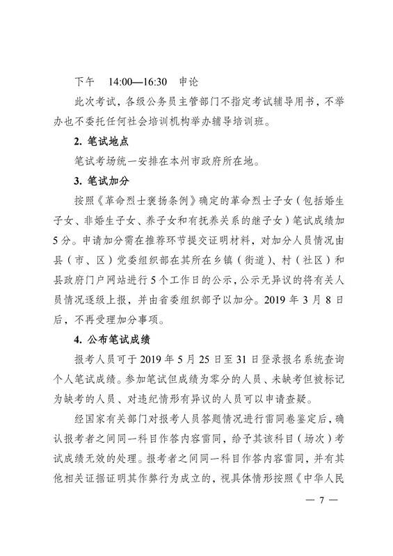 按照《革命烈士褒扬条例》确定的革命烈士子女(包括婚生子女、非婚生子女、养子女和有抚养关系的继子女)笔试成绩加5 分。申请加分需在推荐环节提交证明材料,对加分人员情况由县(市、区)党委组织部在其所在乡镇(街道)、村(社区)和县政府门户网站进行 5 个工作日的公示,公示无异议的将有关人员情况逐级上报,并由省委组织部予以加分。2019 年 3 月 8 日后,不再受理加分事项。