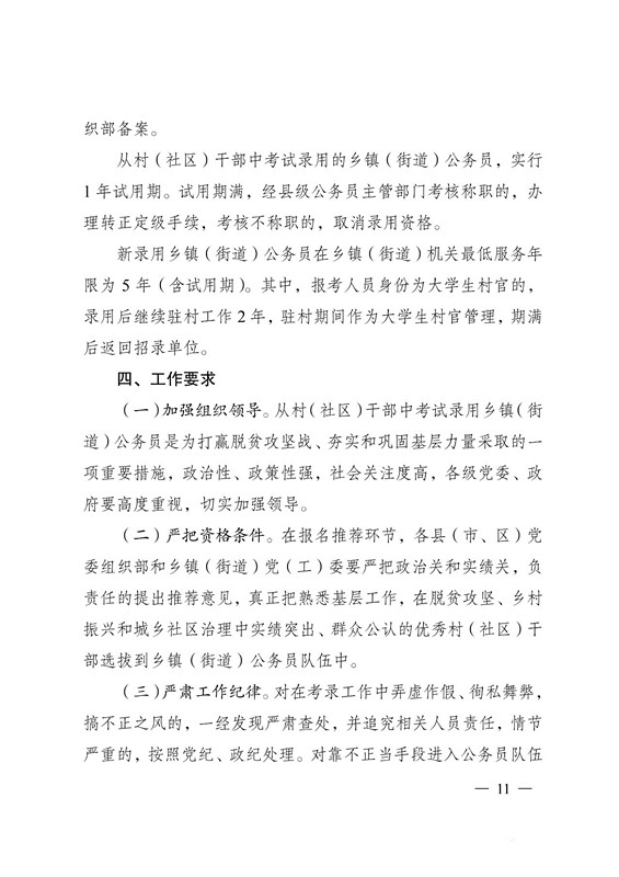 (一)加强组织领导。从村(社区)干部中考试录用乡镇(街道)公务员是为打赢脱贫攻坚战、夯实和巩固基层力量采取的一项重要措施,政治性、政策性强,社会关注度高,各级党委、政府要高度重视,切实加强领导。