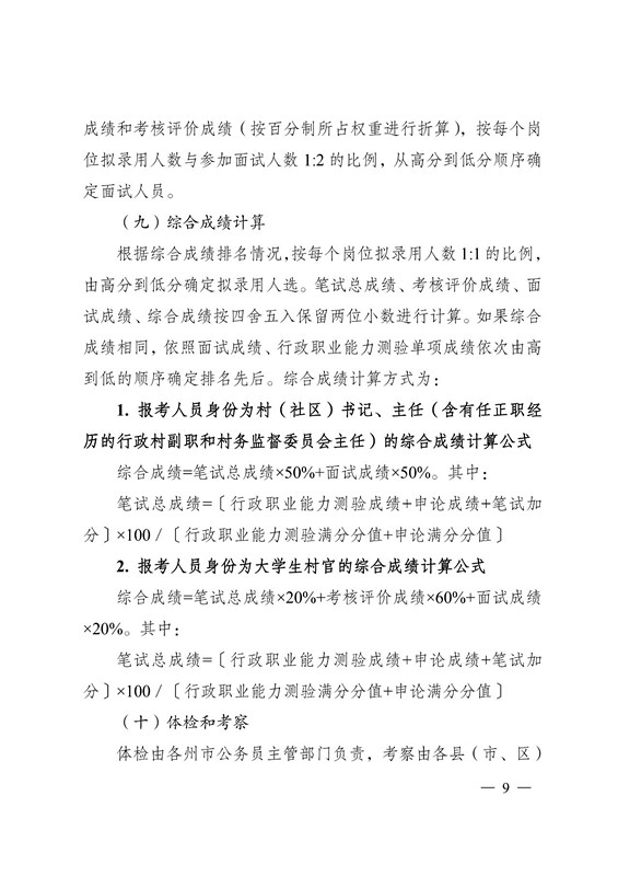笔试总成绩=〔行政职业能力测验成绩+申论成绩+笔试加分〕×100/〔行政职业能力测验满分分值+申论满分分值〕(十)体检和考察体检由各州市公务员主管部门负责,考察由各县(市、区)公务员主管部门组织。