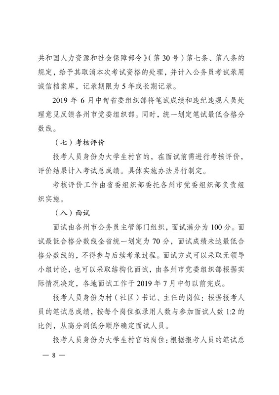 面试由各州市公务员主管部门组织,面试满分为 100 分。面试最低合格分数线全省统一划定为 70 分,面试成绩未达最低合格分数线的,不得参与后续考录过程。面试方式可以采取无领导小组讨论,也可以采取结构化面试,由各州市党委组织部根据实际情况决定,各地面试工作于 2019 年 7 月中旬以前完成。报考人员身份为村(社区)书记、主任的岗位:根据报考人员的笔试总成绩,按每个岗位拟录用人数与参加面试人数 1:2 的比例,从高分到低分顺序确定面试人员。报考人员身份为大学生村官的岗位:根据报考人员的笔试总成绩和考核评价成绩(按百分制所占权重进行折算),按每个岗位拟录用人数与参加面试人数 1:2 的比例,从高分到低分顺序确定面试人员。